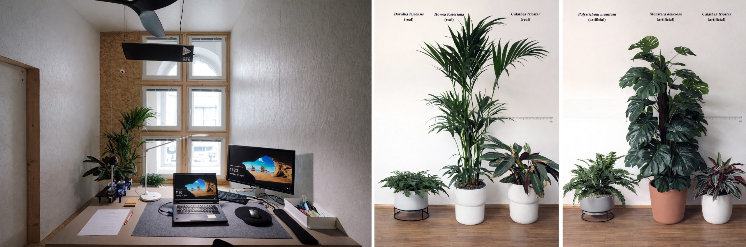 Left, experimental setting inside the testing room, viewed from the test subject’s perspective. Right, plants used in the experiment (real plants vs artifical “placebo” scenario).
